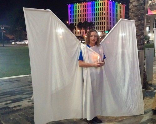 Before and afterwards concert-goers roamed the memorials outside the Dr. Phillips Center, which were surrounded by members of the Angel Wing Project -- "winged" volunteers who in the days following the mass shooting assembled outside the funerals of victims to protect family members from anti-gay protestors. They have performed ministry.